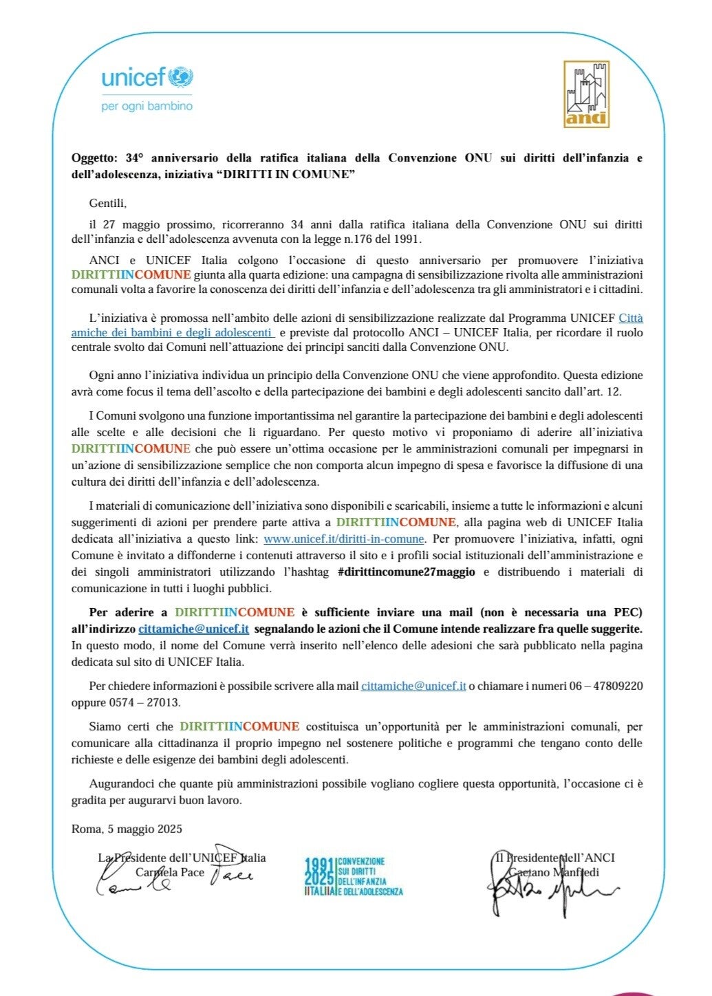 In occasione del prossimo 27 maggio, 34° anniversario della Convenzione ONU sui diritti dell’infanzia e dell’adolescenza, anche quest’anno è stata lanciata l’iniziativa di sensibilizzazione DIRITTI IN COMUNE organizzata nell’ambito delle attività promosse dal Programma Città amiche dei bambini e degli adolescenti